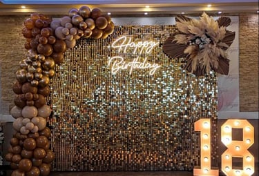 Stylish balloon décor created for ages 18, 21, 30, 40, 50+ and more. Includes a themed balloon setup, backdrop or garland, and LED number displays for a standout milestone look.