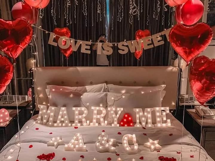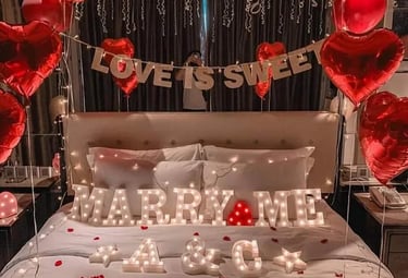 Romantic room décor featuring balloons and thoughtful touches to create an intimate proposal moment.