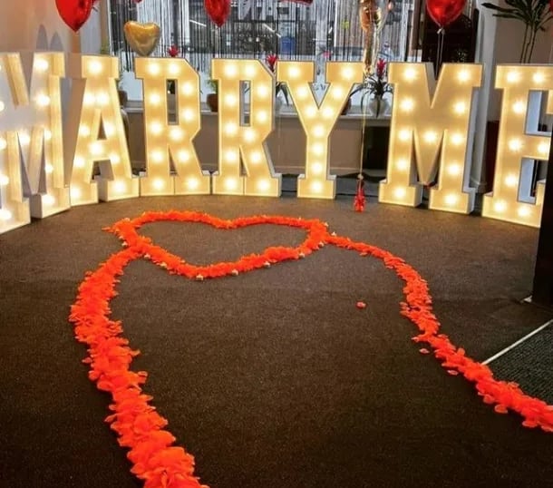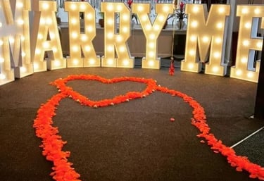 Large illuminated “MARRY ME” letters with a heart-shaped rose petal walkway. Perfect for romantic indoor proposals.