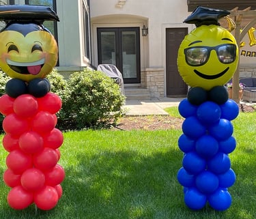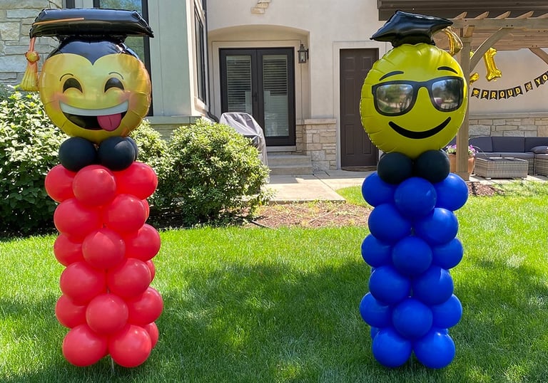 Fun emoji-themed balloon columns topped with graduation caps. A bright, playful way to celebrate grads at home, school or outdoor events.